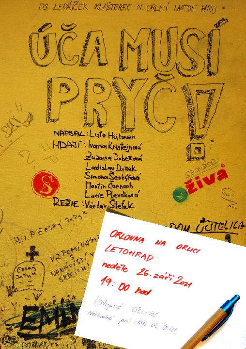 Po dlouhé době se dočkal svého vystoupení ochotnický divadelní soubor Ledříček. Své nejčerstvější představení předvede na prknech Orlovny na Orlici u Letohradu v neděli 26. září v 19 hodin. Víc informací na plakátě v příloze.
