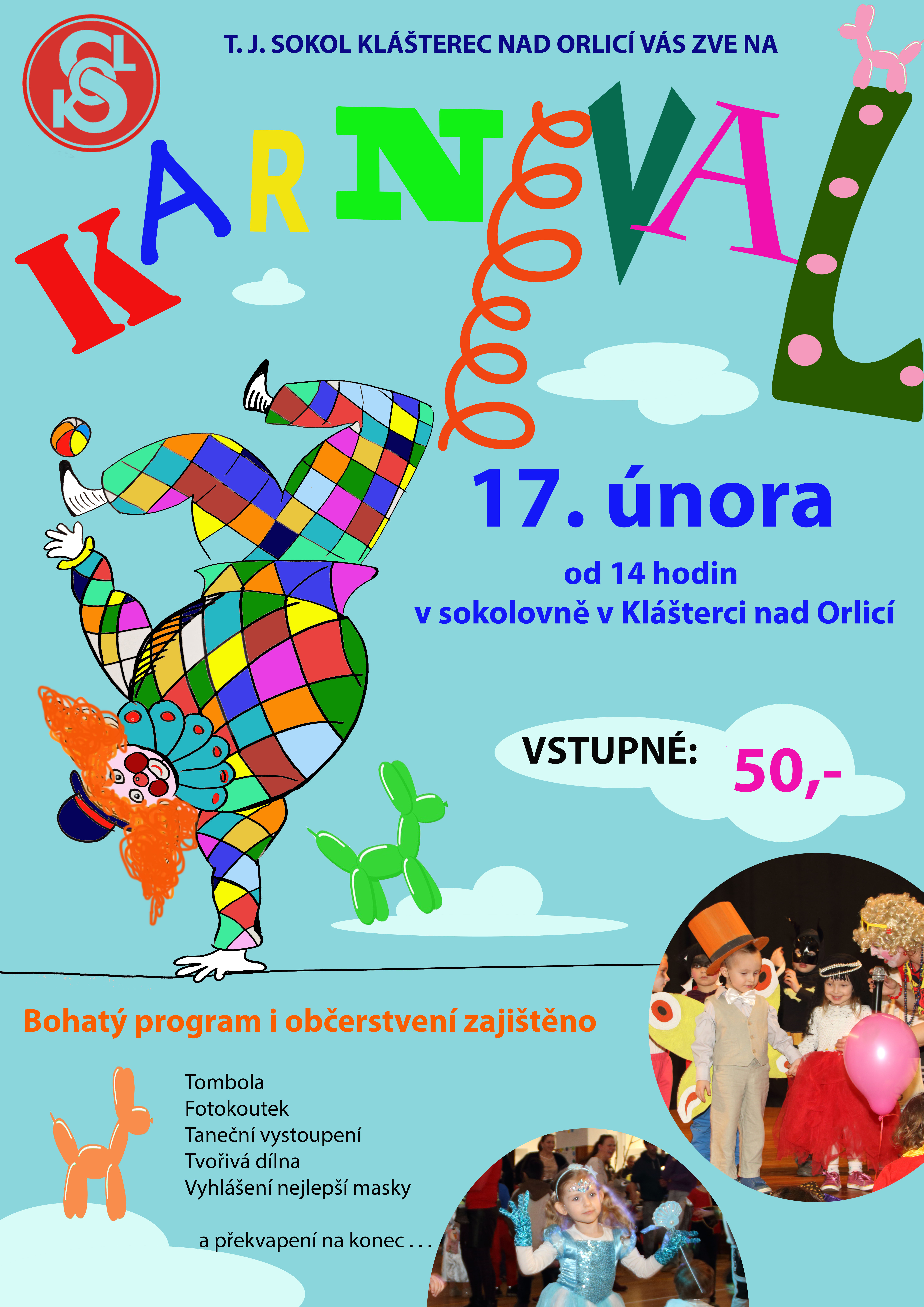 V sobotu 17. února od 14 hodin vypukne v klášterecké sokolovně dětský karneval. Pořadatelky ze sokolského oddílu Cvičení rodičů s dětmi a minižáčků připravili bohatý program se sportem, tancem, tvořivou dílnou, fotokoutkem. A ke karnevalu samozřejmě patří vyhlášení masek, chybět nebude ani tombola, díky sponzorům opravdu bohatá. Na konci bude čekat malé překvapení. Překvapení bude ovšem i na začátku, a to v podobě symbolického vstupného pouhých 50 Kč. Díky maminkám budou moci nejen děti, ale i dospělí ochutnat řadu dobrot z jejich kuchyní, z pípy poteče proudem malinovka, ani pivo pro tatínky chybět nebude.